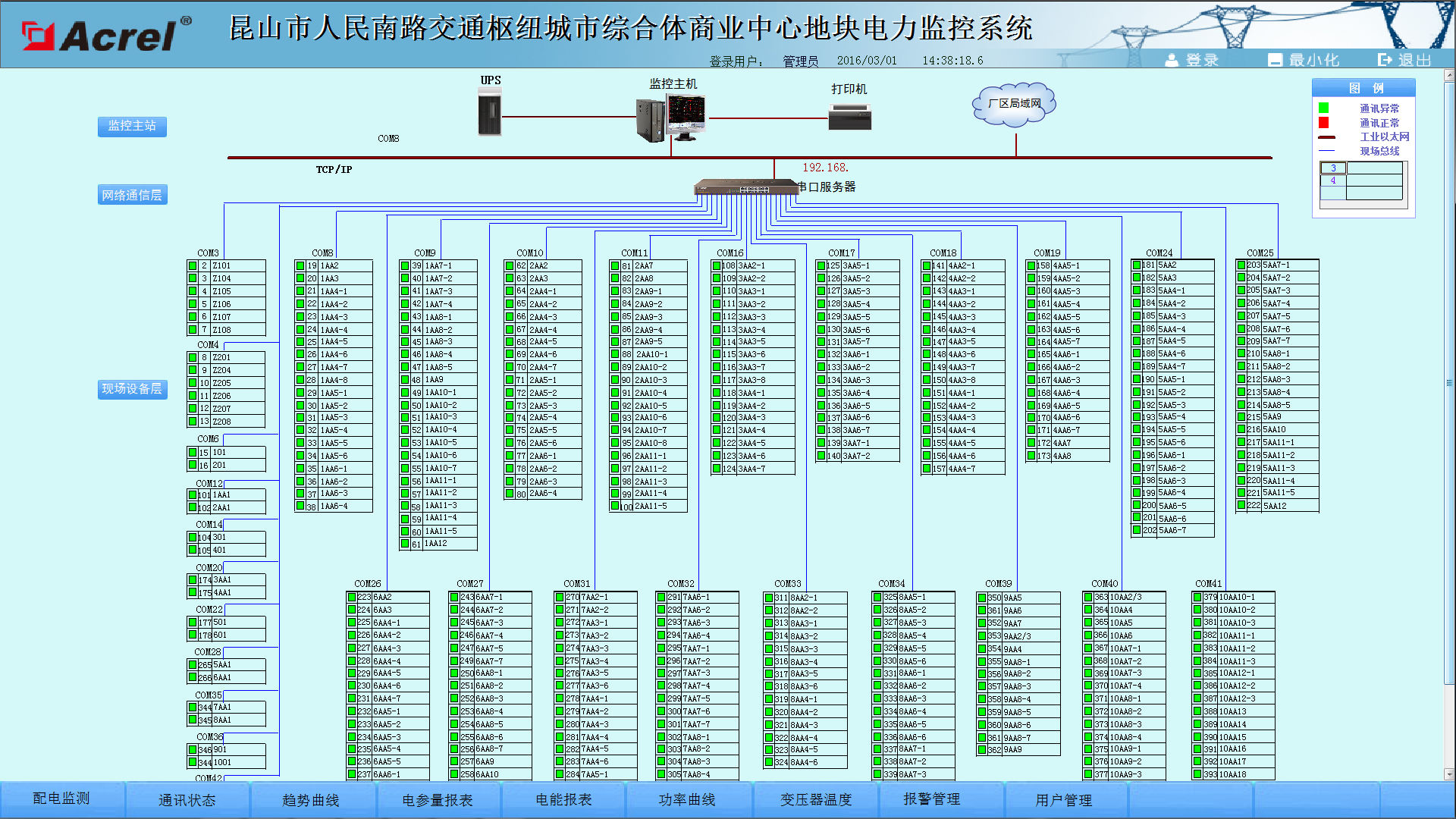 主要功能:具備完整的系統(tǒng)通訊拓?fù)浣Y(jié)構(gòu)圖,實(shí)時(shí)顯示設(shè)備通訊狀態(tài),紅色狀態(tài)表示對(duì)應(yīng)設(shè)備通訊正常,綠色狀態(tài)表示設(shè)備通訊異常。系統(tǒng)主機(jī)和串口服務(wù)器/通訊管理機(jī)旁標(biāo)明設(shè)備分配IP地址,各設(shè)備旁標(biāo)識(shí)了設(shè)備地址和設(shè)備回路編號(hào)。