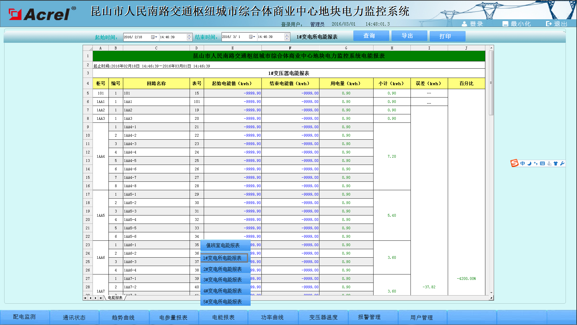安科瑞Acrel-2000電力監(jiān)控系統(tǒng)以豐富的報(bào)表體支撐量體系的完整性。系統(tǒng)具備定時(shí)抄表匯總統(tǒng)計(jì)功能,用戶(hù)可以自由查詢(xún)自系統(tǒng)正常運(yùn)行以來(lái)任意時(shí)間段內(nèi)各配電節(jié)點(diǎn)的用電情況,即該節(jié)點(diǎn)進(jìn)線(xiàn)用電量與各分支回路消耗電量的統(tǒng)計(jì)分析報(bào)表。該功能使得用電可視透明,并在用電誤差偏大時(shí)可分析追溯,維護(hù)計(jì)量體系的正確性。