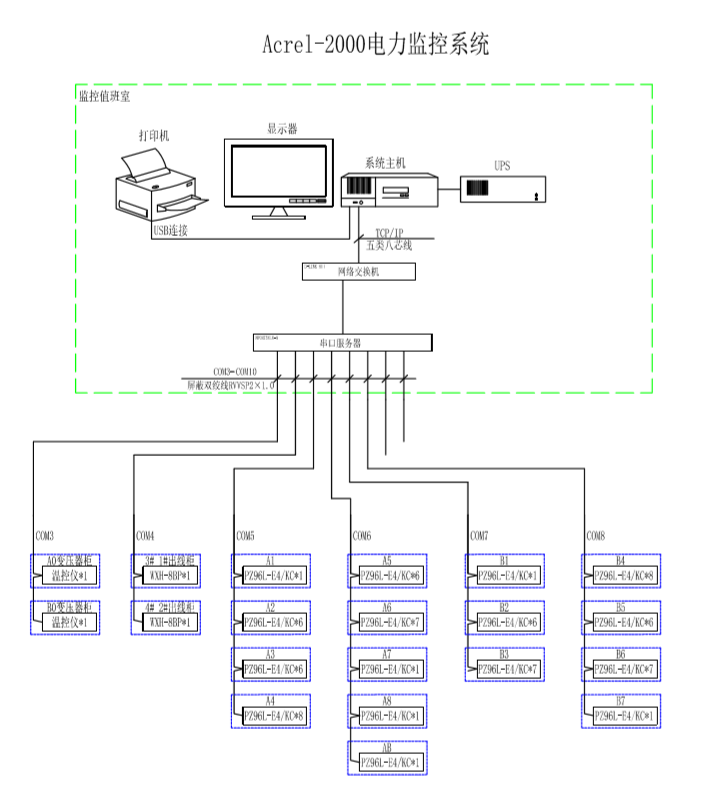 現(xiàn)針對(duì)本項(xiàng)目中的變電所進(jìn)出線多功能儀表設(shè)計(jì)一套電力監(jiān)控系統(tǒng)。電力監(jiān)控系統(tǒng)通過(guò)采集現(xiàn)場(chǎng)各種智能設(shè)備的數(shù)據(jù),后臺(tái)集中顯示、存儲(chǔ),并通過(guò)相應(yīng)的報(bào)表等形式顯示導(dǎo)出。