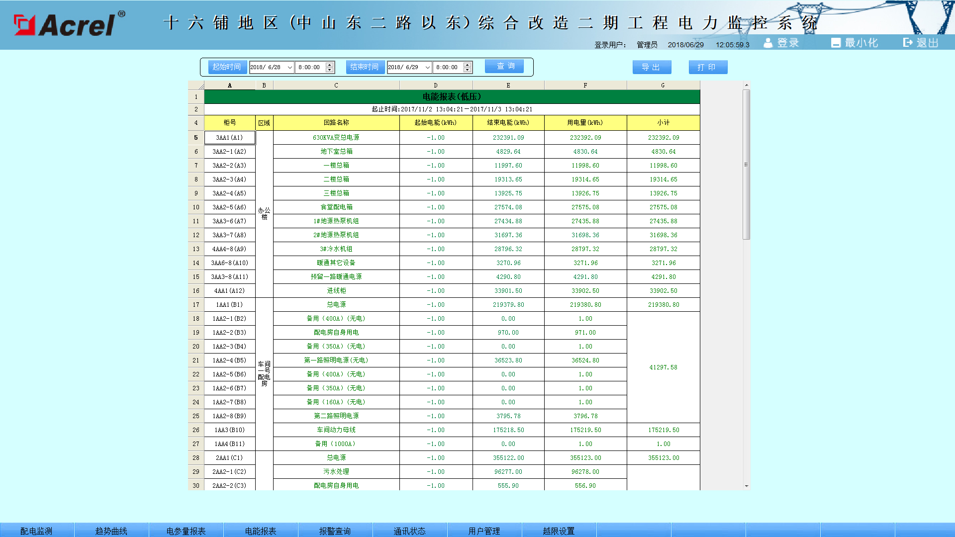 電能報(bào)表是對(duì)用電量的管理以報(bào)表形式呈現(xiàn),該報(bào)表可以實(shí)現(xiàn)系統(tǒng)運(yùn)行期間的任意時(shí)間段內(nèi)的月抄表,日抄表,小時(shí)抄表等功能,且可以Excel形式導(dǎo)出或打印。界面如圖5所示。