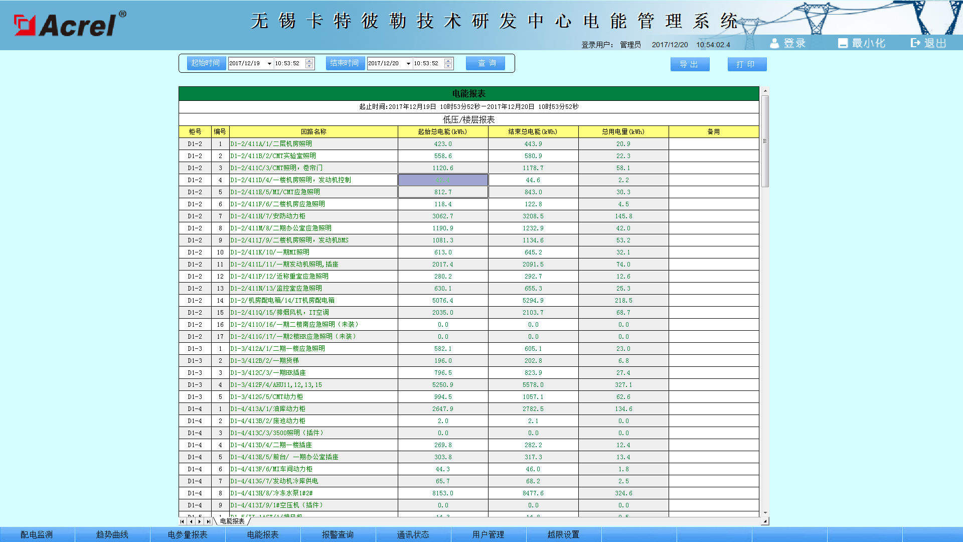用電量報(bào)表功能,可選擇時(shí)間段進(jìn)行查詢,支持任意時(shí)間段電度累計(jì)查詢,具備數(shù)據(jù)導(dǎo)出和報(bào)表打印等功能。為值班人員提供了可靠的電能報(bào)表。該報(bào)表各回路名稱和數(shù)據(jù)庫(kù)關(guān)聯(lián),方便用戶修改回路名稱。如下圖所示,顯示辦公樓實(shí)驗(yàn)樓配電回路的用電量,用戶可以直接打印報(bào)表,可以以EXCEL格式另存到其他位置。 如下圖所示: