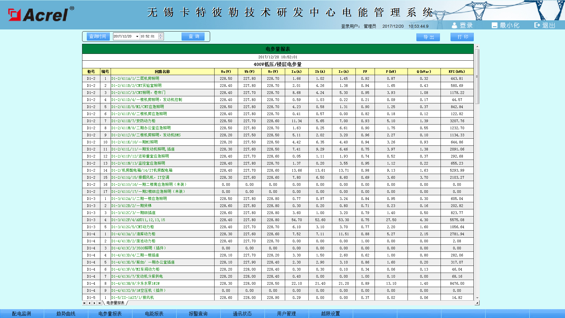 參數(shù)抄表功能,主要對(duì)低壓各出線回路的電參數(shù)進(jìn)線查詢。支持任意時(shí)刻電參數(shù)查詢,具備數(shù)據(jù)導(dǎo)出和報(bào)表打印等功能。該報(bào)表查詢一科大廈樓層配電箱進(jìn)出線各低壓回路的電參數(shù),主要包括:三相電流、有功功率和有功電度。該報(bào)表各回路名稱和數(shù)據(jù)庫(kù)關(guān)聯(lián),方便用戶修改回路名稱。如下圖所示