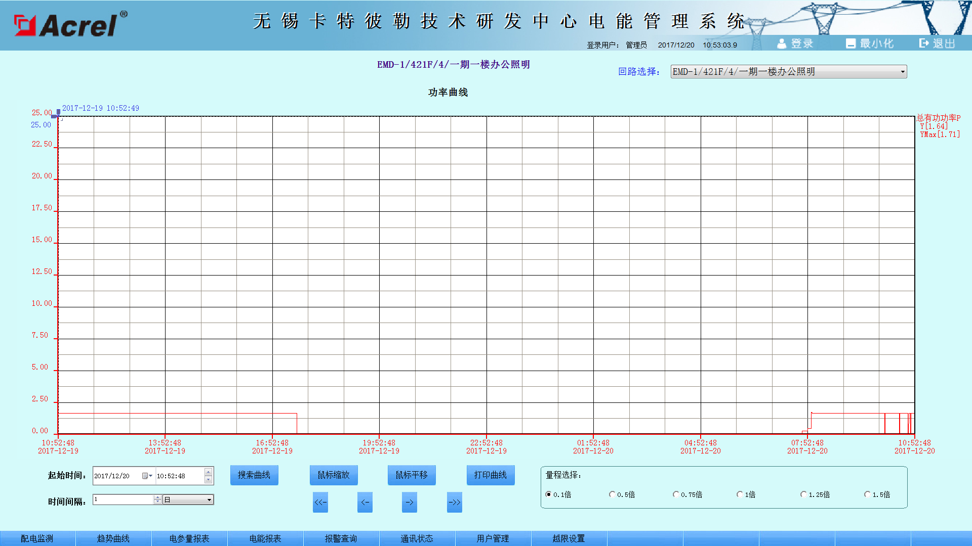 負(fù)荷趨勢(shì)曲線界面中可直觀的查看回路的負(fù)荷運(yùn)行情況。查看實(shí)時(shí)和歷史趨勢(shì)曲線,點(diǎn)擊畫面相應(yīng)按鈕或菜單項(xiàng)可以完成相應(yīng)功能的切換;幫助用戶進(jìn)線趨勢(shì)分析和故障追憶,具備曲線打印功能。為分析整個(gè)系統(tǒng)的運(yùn)行狀況提供了直觀而方便的軟件支持。如下圖所示: