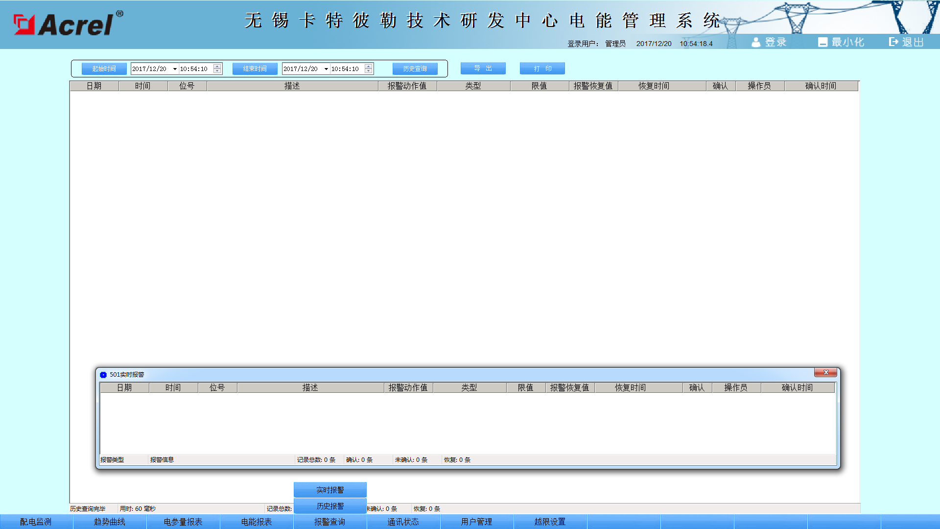遙信和遙測(cè)報(bào)警功能,主要完成對(duì)低壓各出線回路的開關(guān)運(yùn)行狀態(tài)和負(fù)載進(jìn)線監(jiān)控,對(duì)開關(guān)變位和負(fù)載越限彈出報(bào)警界面指示具體的報(bào)警位置并聲音報(bào)警,提醒值班人員及時(shí)處理。負(fù)載越限值在相應(yīng)權(quán)限下可自由設(shè)置。具備歷史查詢功能,如下圖所示: