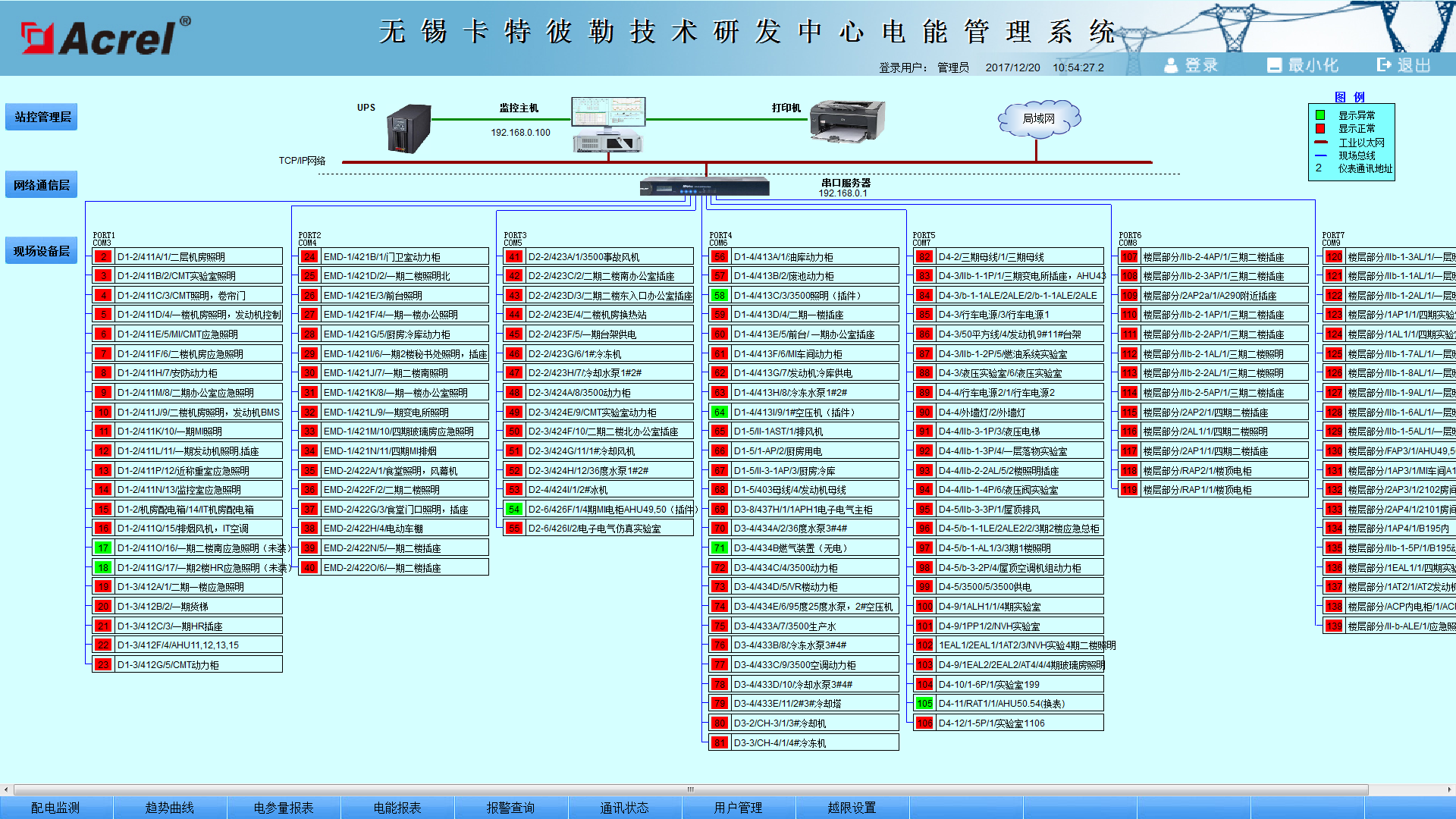 現(xiàn)場(chǎng)共計(jì)76只PZ72L-E4/C、46只PZ96L-E4/C和16只DTSD1352-C分為8條RS485總線接至配電房的串口服務(wù)器,串口服務(wù)器通過網(wǎng)線拉至值班室連接到監(jiān)控主機(jī)實(shí)現(xiàn)總線上儀表與監(jiān)控主機(jī)的數(shù)據(jù)連通。