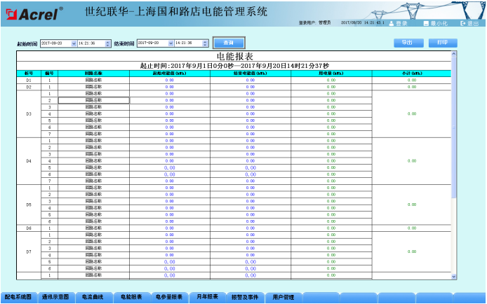 電能管理系統(tǒng)以豐富的數(shù)據(jù)報(bào)表體現(xiàn)計(jì)量體系的完整性。系統(tǒng)具備各回路定時(shí)抄表匯總統(tǒng)計(jì)功能,用戶可自由查詢自系統(tǒng)正常運(yùn)行以來任意時(shí)間段內(nèi)各配電節(jié)點(diǎn)的用電情況,即該節(jié)點(diǎn)進(jìn)線用電量與各分支回路消耗電量的統(tǒng)計(jì)分析報(bào)表。該功能使得用電可視透明,并在用電誤差偏大時(shí)可追溯,維護(hù)計(jì)量體系的正確性。