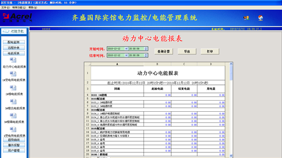 電能報(bào)表:重要回路電能按時(shí)間短進(jìn)行查詢計(jì)算、打印、導(dǎo)出。
