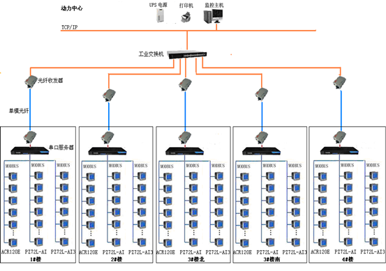 整個(gè)系統(tǒng)采用網(wǎng)絡(luò)分布式結(jié)構(gòu),監(jiān)控主機(jī)位于2#樓前面地下一層的動(dòng)力中心中,其他5個(gè)配電室分別位于1#、2#、3#、4#地下一層(其中3#有南北兩個(gè)配電室)。該項(xiàng)目實(shí)現(xiàn)了淄博運(yùn)動(dòng)員公寓4個(gè)樓內(nèi)電力系統(tǒng)的智能管理。設(shè)計(jì)方案為4個(gè)樓內(nèi)的5個(gè)配電室,通過光電轉(zhuǎn)換器經(jīng)過光纖拉倒2#樓前面地下一層的動(dòng)力中心。5個(gè)配電室現(xiàn)場(chǎng)放置通訊機(jī)柜,儀表數(shù)據(jù)通過485接口,MODBUS通訊協(xié)議經(jīng)光電轉(zhuǎn)換器輸送到動(dòng)力中心。