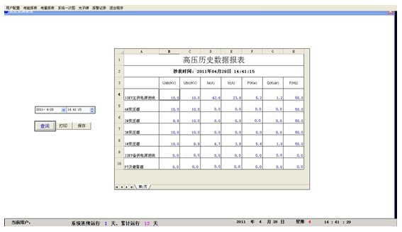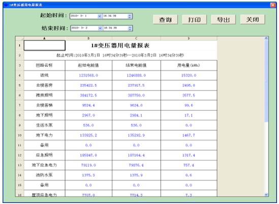 此電能報表支持手動輸入時間查詢?nèi)魏螘r段和任何回路的耗電量。同一變壓器下的出線回路安排在同一個電能報表內(nèi),便于管理人員的統(tǒng)計管理。系類報表可設(shè)計成用戶慣用的電能報表格式,以延續(xù)工作人員的工作風(fēng)格。