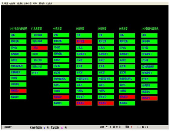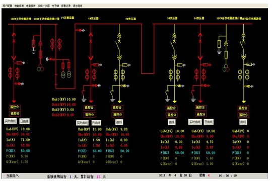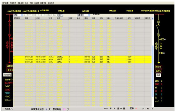 系統(tǒng)提供簡單、易用、良好的用戶使用界面。采用全中文界面,配電系統(tǒng)電氣一次主接線圖,顯示設(shè)備狀態(tài)及實時運行參數(shù);畫面實時動態(tài)刷新;模擬量顯示;開關(guān)量顯示;報警記錄顯示等。