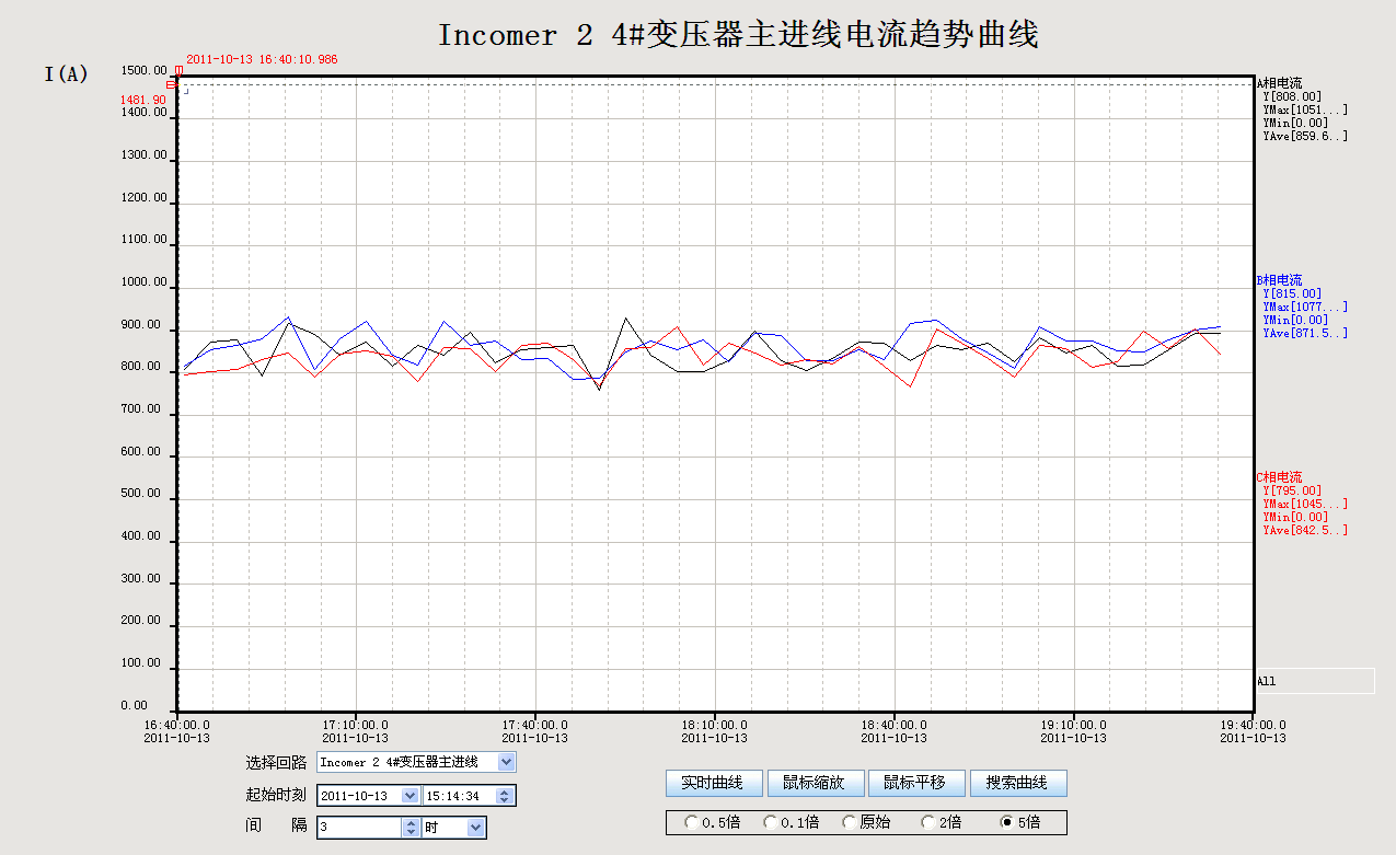 本系統(tǒng)對于重要回路,不僅可以對電流進(jìn)行實時顯示與監(jiān)測,并可以根據(jù)保存的歷史數(shù)據(jù)做成趨勢曲線,可以查看實時和歷史變化趨勢,預(yù)測電力負(fù)荷容量,并可對電力故障進(jìn)行查詢,保證電力負(fù)荷的安全運行。如圖5所示。