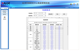 用電量報(bào)表功能,可選擇時(shí)間段進(jìn)行查詢,支持任意時(shí)間段電度累計(jì)查詢,具備數(shù)據(jù)導(dǎo)出和報(bào)表打印等功能。為值班人員提供了可靠的電能報(bào)表。該報(bào)表各回路名稱和數(shù)據(jù)庫關(guān)聯(lián),方便用戶修改回路名稱。如下圖所示,顯示配電回路的用電量,用戶可以直接打印報(bào)表,可以以EXCEL格式另存到其他位置。 如下圖所示: