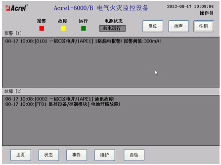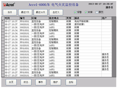 本套上位機(jī)軟件Acrel-6000電氣火災(zāi)系統(tǒng)。主要有以下功能特點(diǎn):友好的人機(jī)界面,可實(shí)時(shí)和定時(shí)采集現(xiàn)場(chǎng)設(shè)備的剩余電流數(shù)據(jù),并有報(bào)警提示聲光報(bào)警等功能。客戶可根據(jù)實(shí)際需要對(duì)漏電流報(bào)警值進(jìn)行設(shè)置,報(bào)警故障解除時(shí),可遠(yuǎn)方進(jìn)行復(fù)位。系統(tǒng)可對(duì)報(bào)警事件、日期、報(bào)警值、越線值進(jìn)行記錄,并生成報(bào)表,可對(duì)報(bào)警事件記錄進(jìn)行打印。
