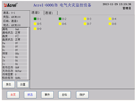 現(xiàn)場(chǎng)ARCM300電氣火災(zāi)探測(cè)器采集數(shù)據(jù)上傳到本界面,客戶可根據(jù)需要對(duì)回路名稱進(jìn)行修改,方格內(nèi)可以顯示相應(yīng)柜子剩余電流實(shí)時(shí)值,數(shù)據(jù)可周期性更新。當(dāng)剩余電流實(shí)測(cè)值大于報(bào)警設(shè)置時(shí),系統(tǒng)報(bào)警狀態(tài)指示燈會(huì)自動(dòng)閃爍。界面下端的報(bào)警提示滾動(dòng)條會(huì)自動(dòng)提示報(bào)警回路名稱,方便運(yùn)行人員檢查處理故障。