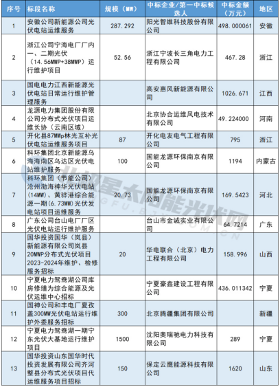 在光伏、儲能行業(yè)飛速發(fā)展的同時(shí),已建的光伏、風(fēng)力發(fā)電站和儲能系統(tǒng)的監(jiān)控、運(yùn)維管理項(xiàng)目的招標(biāo)也非常多,2023年上半年,光伏電站開發(fā)企業(yè)運(yùn)維招標(biāo)規(guī)模28.6GW,同比增長204.3%,上述28.6GW招標(biāo)項(xiàng)目中,目前公布中標(biāo)結(jié)果的共計(jì)14.9GW,中標(biāo)情況見表1。光伏代運(yùn)維價(jià)格因光伏電站的地理分布、容量、環(huán)境以及考核條件的不同,價(jià)格也會有較大的差異,從表1可以看出運(yùn)維價(jià)格低至1.93元/年*kW。