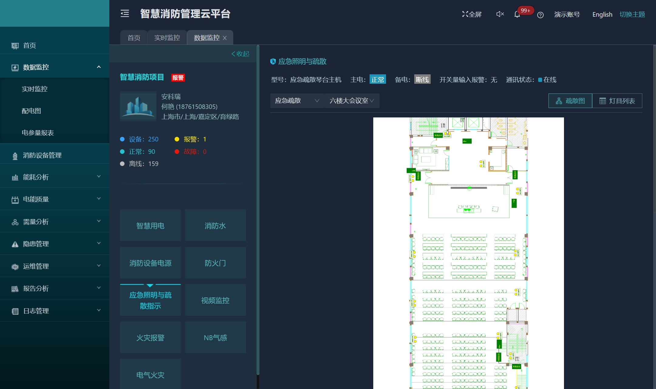 消防應(yīng)急照明和疏散指示,根據(jù)預(yù)先設(shè)置的應(yīng)急預(yù)案快速啟動(dòng)疏散方案引導(dǎo)人員疏散。系統(tǒng)接入消防應(yīng)急照明指示系統(tǒng)數(shù)據(jù),通過平面圖顯示疏散指示燈具工作狀態(tài)和異常情況。