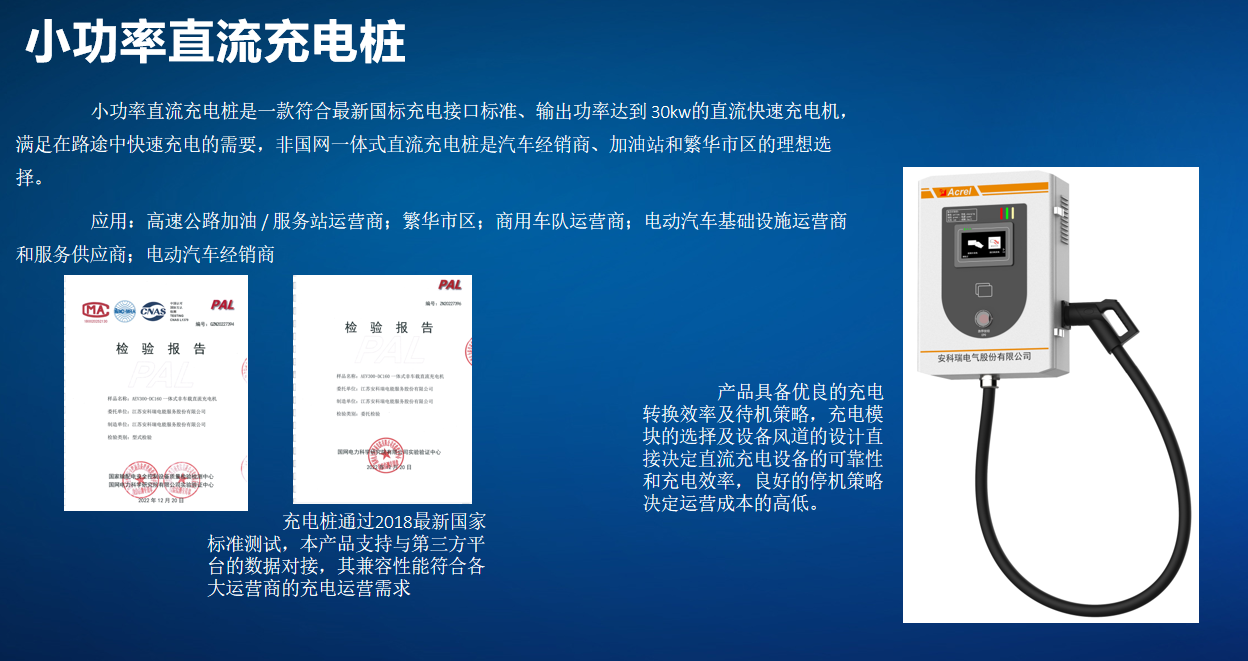 小功率直流充電樁是一款符合最新國標(biāo)充電接口標(biāo)準(zhǔn)、輸出功率達(dá)到 30kw的直流快速充電機(jī),滿足在路途中快速充電的需要,非國網(wǎng)一體式直流充電樁是汽車經(jīng)銷商、加油站和繁華市區(qū)的理想選擇。