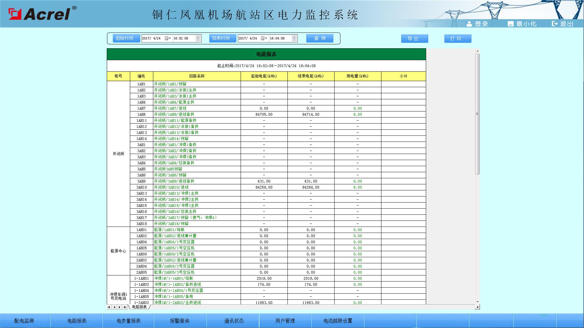 參數(shù)抄表功能,主要對低壓各出線回路的電參數(shù)進(jìn)線查詢。支持任意時(shí)刻電參數(shù)查詢,具備數(shù)據(jù)導(dǎo)出和報(bào)表打印等功能。該報(bào)表查詢供兩個(gè)變電所4臺變壓器出線各低壓回路的電參數(shù),主要包括:三相電流、有功功率和有功電度及變壓器溫度。該報(bào)表各回路名稱和數(shù)據(jù)庫關(guān)聯(lián),方便用戶修改回路名稱。見圖(2)。