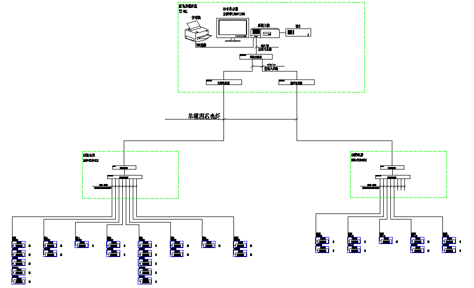本項(xiàng)目共160只多功能儀表,分布在兩個(gè)配電房內(nèi),現(xiàn)場智能儀表經(jīng)485總線連接至本配電房內(nèi)的采集裝置,采集裝置通過單模四芯光纖將數(shù)據(jù)傳輸至監(jiān)控主機(jī)上。