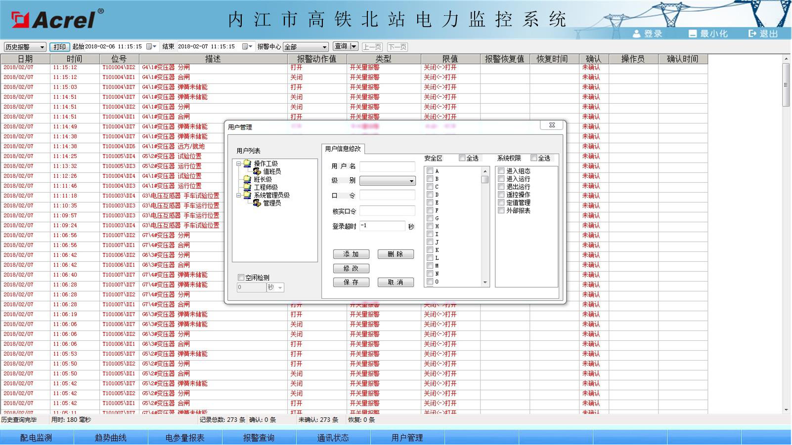 針對(duì)不同級(jí)別的用戶,設(shè)置不同的權(quán)限組,防止因人為誤操作給生產(chǎn),生活帶來的損失,實(shí)現(xiàn)配電系統(tǒng)的安全,可靠運(yùn)行??梢酝ㄟ^用戶管理進(jìn)行用戶登錄、用戶注銷、修改密碼、添加刪除等操作,方便用戶對(duì)賬號(hào)和權(quán)限的修改。