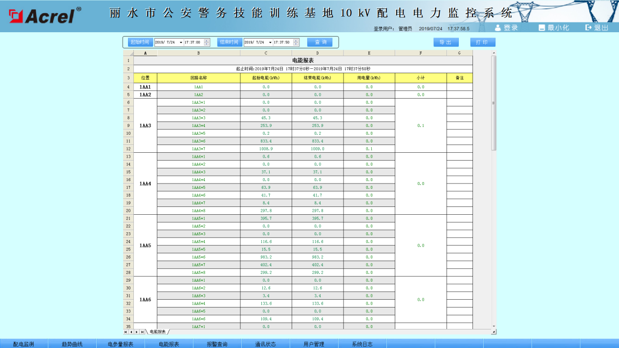 電能報表是對用電量的管理以報表形式呈現(xiàn),該報表可以實現(xiàn)系統(tǒng)運行期間的任意時間段內的月抄表,日抄表,小時抄表等功能,且可以Excel形式導出或打印。界面如圖6所示。