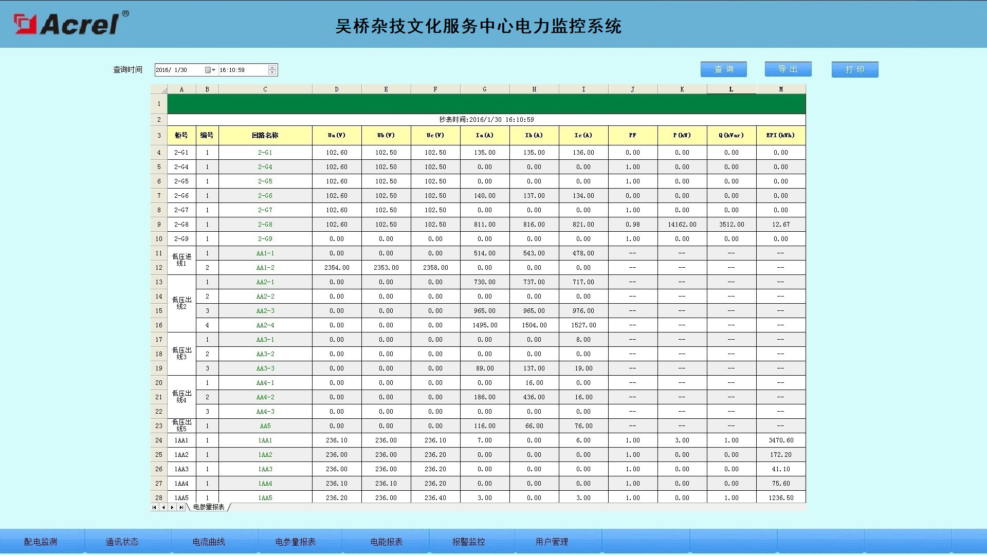 報(bào)表具有自由設(shè)置查詢時(shí)間實(shí)現(xiàn)日、月、年的電能統(tǒng)計(jì),數(shù)據(jù)導(dǎo)出和報(bào)表打印等功能。