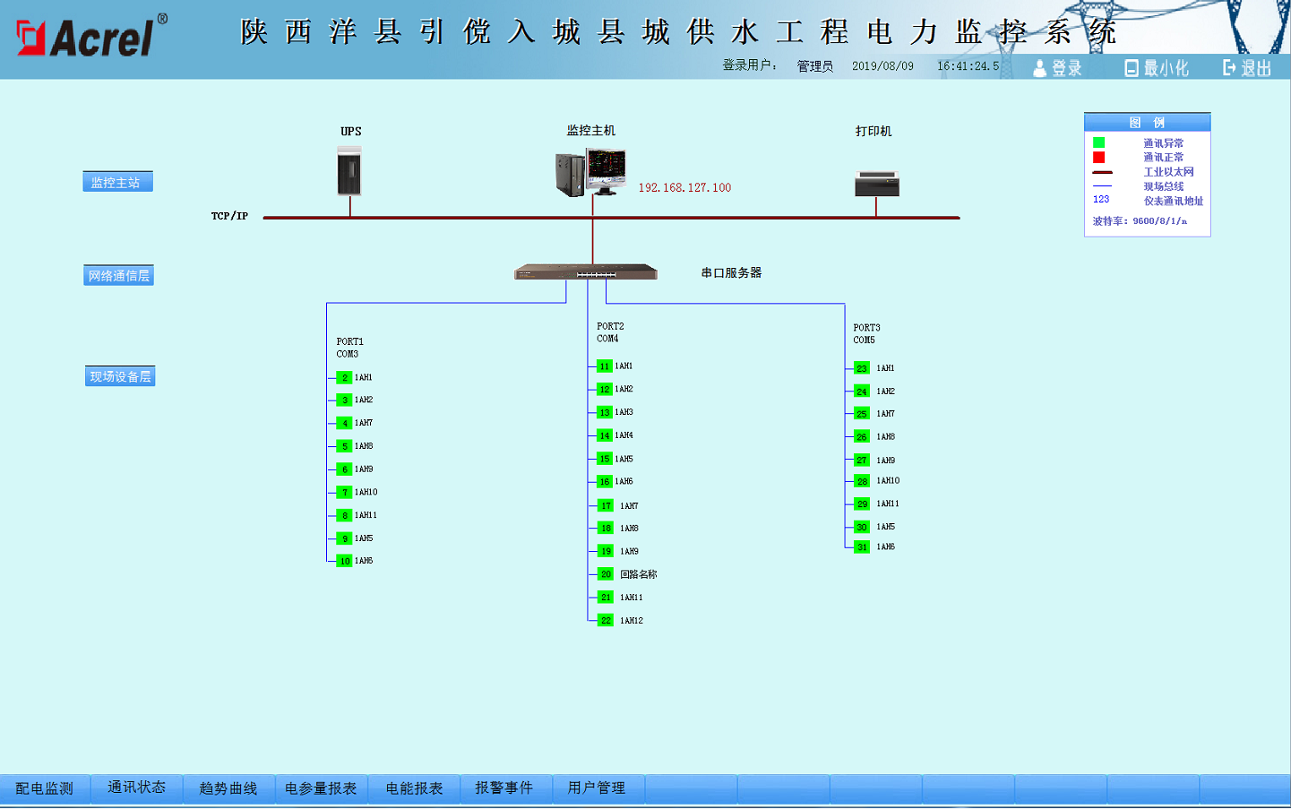 現(xiàn)場(chǎng)共計(jì)30臺(tái)多功能計(jì)量?jī)x表,通過3條RS485總線接至配電房的各個(gè)串口服務(wù)器,串口服務(wù)器通過光纖拉至值班室連接到監(jiān)控主機(jī)實(shí)現(xiàn)總線上儀表與監(jiān)控主機(jī)的數(shù)據(jù)連通。