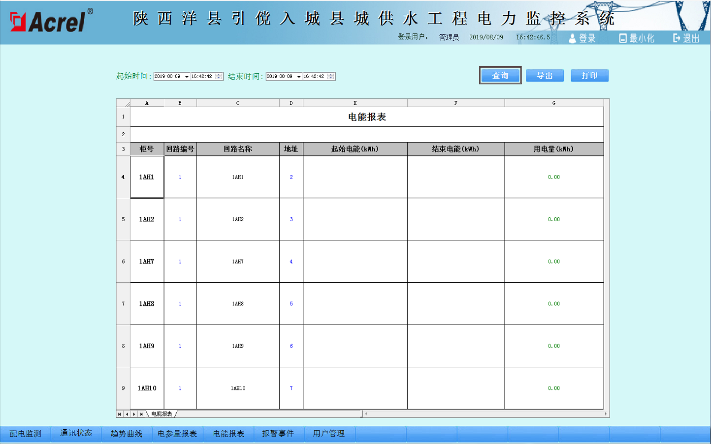 用電量報(bào)表功能,可選擇時(shí)間段進(jìn)行查詢,支持任意時(shí)間段電度累計(jì)查詢,具備數(shù)據(jù)導(dǎo)出和報(bào)表打印等功能。為值班人員提供了準(zhǔn)確可靠的電能報(bào)表。該報(bào)表各回路名稱和數(shù)據(jù)庫(kù)關(guān)聯(lián),方便用戶修改回路名稱。如下圖所示,顯示辦公樓實(shí)驗(yàn)樓配電回路的準(zhǔn)確用電量,用戶可以直接打印報(bào)表,可以以EXCEL格式另存到其他位置。 如下圖所示: