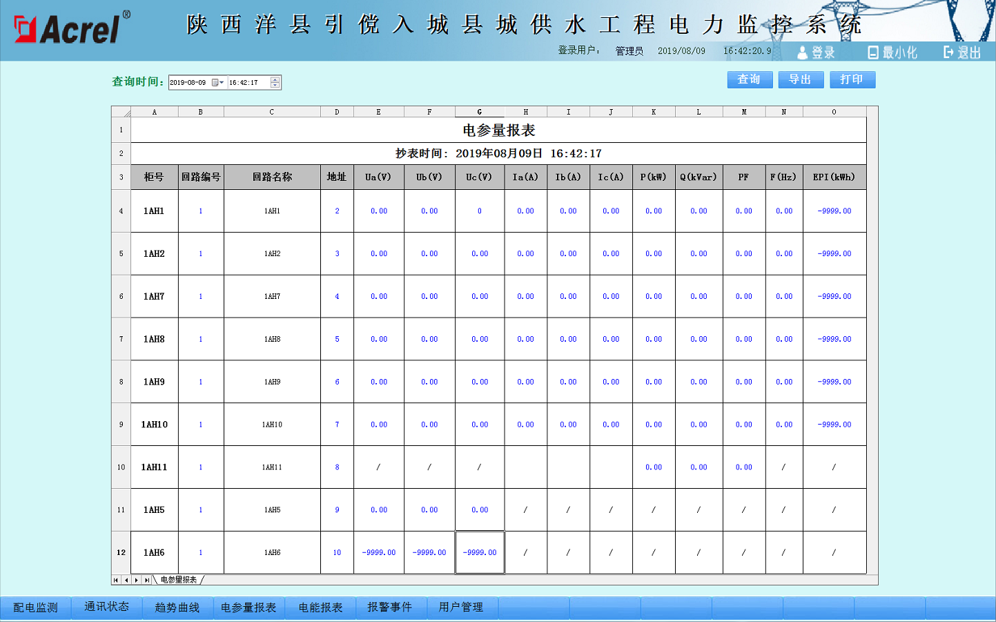 參數(shù)抄表功能,主要對(duì)低壓各出線回路的電參數(shù)進(jìn)線查詢。支持任意時(shí)刻電參數(shù)查詢,具備數(shù)據(jù)導(dǎo)出和報(bào)表打印等功能。該報(bào)表查詢一科大廈樓層配電箱進(jìn)出線各低壓回路的電參數(shù),主要包括:三相電流、有功功率和有功電度。該報(bào)表各回路名稱和數(shù)據(jù)庫(kù)關(guān)聯(lián),方便用戶修改回路名稱。如下圖所示