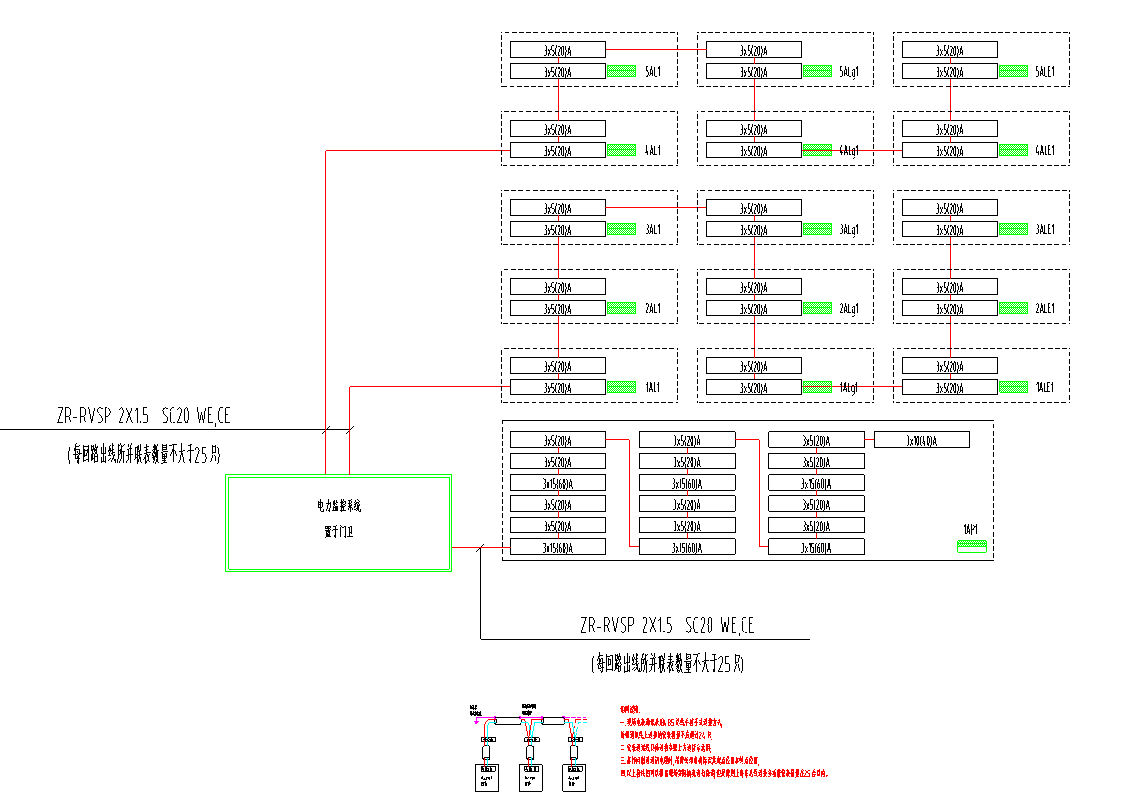 3)現(xiàn)場(chǎng)設(shè)備層 現(xiàn)場(chǎng)設(shè)備層是數(shù)據(jù)采集終端,主要由智能儀表組成,智能儀表通過屏蔽雙絞線RS485接口,采用MODBUS通訊協(xié)議總線型連接接入通訊服務(wù)器,經(jīng)通訊服務(wù)器到達(dá)該配電間監(jiān)控主機(jī)進(jìn)行組網(wǎng),實(shí)現(xiàn)遠(yuǎn)程控制。 智能儀表現(xiàn)場(chǎng)連接示意 現(xiàn)場(chǎng)儀表以手拉手方式通過屏蔽雙絞線(RVSP2*1.0)進(jìn)行通訊連接,每根總線連接智能儀表數(shù)量在20只左右,不同種類的智能裝置連接在不同的總線上,然后將數(shù)據(jù)上傳至串口服務(wù)器,進(jìn)而將數(shù)據(jù)上傳至當(dāng)?shù)乇O(jiān)控終端。具體連接示意圖如下所示:
