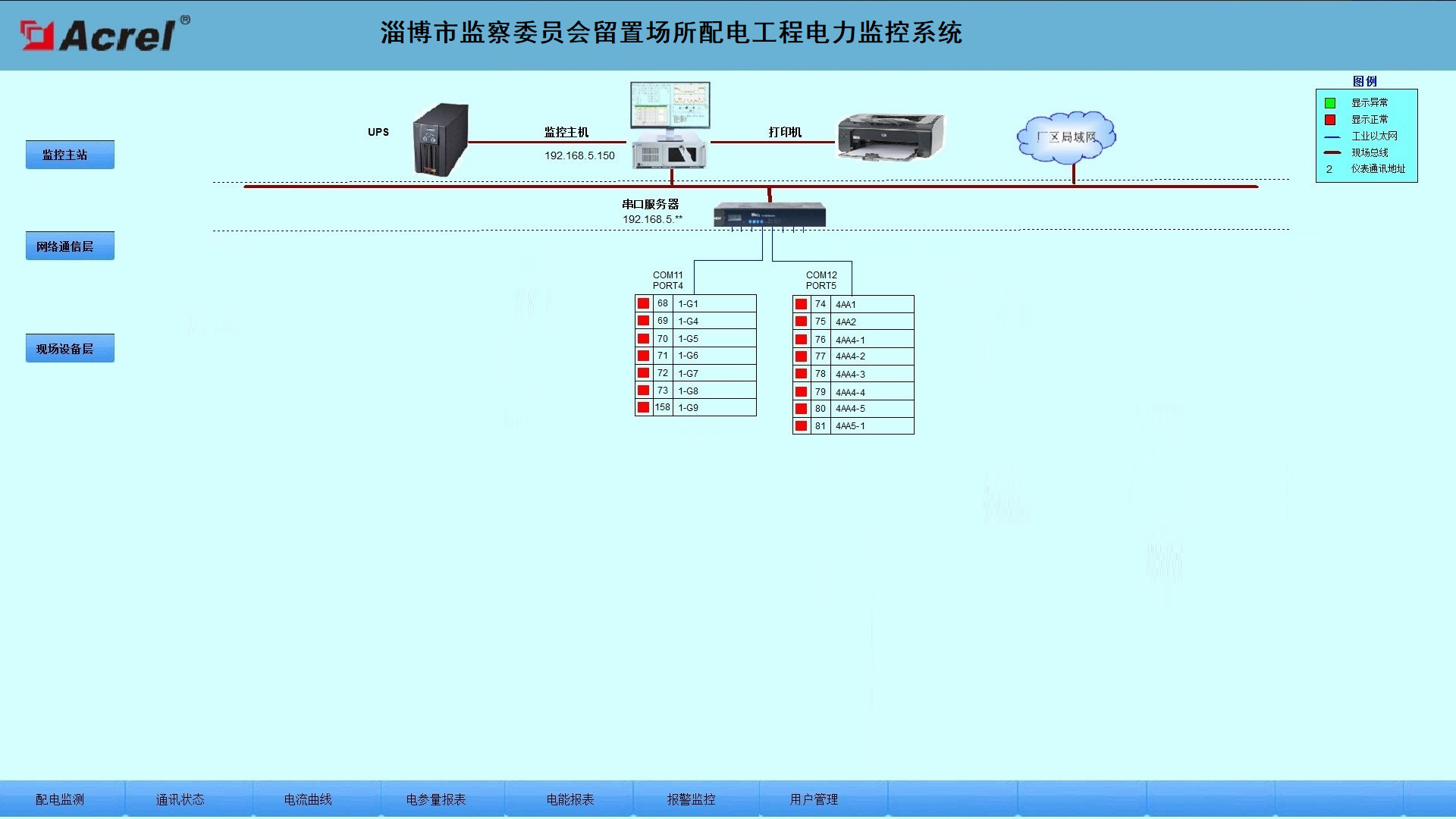 本項(xiàng)目為淄博市監(jiān)察委員會(huì)留置場所配電工程電力監(jiān)控系統(tǒng),根據(jù)智能配電系統(tǒng)管理的要求,現(xiàn)需要對該工程高低壓配電室進(jìn)行電力監(jiān)測,以保證用電的安全、可靠和有效。Acrel-2000型低壓智能配電系統(tǒng),充分利用了現(xiàn)代電子技術(shù)、計(jì)算機(jī)技術(shù)、網(wǎng)絡(luò)技術(shù)和現(xiàn)場總線技術(shù)的發(fā)展,對變配電系統(tǒng)進(jìn)行分散數(shù)據(jù)采集和集中監(jiān)控管理。對配電系統(tǒng)的二次設(shè)備進(jìn)行組網(wǎng),通過計(jì)算機(jī)和通訊網(wǎng)絡(luò),將分散的配電所的現(xiàn)場設(shè)備連接為一個(gè)有機(jī)的整體,實(shí)現(xiàn)電網(wǎng)運(yùn)行的遠(yuǎn)程監(jiān)控和集中管理。