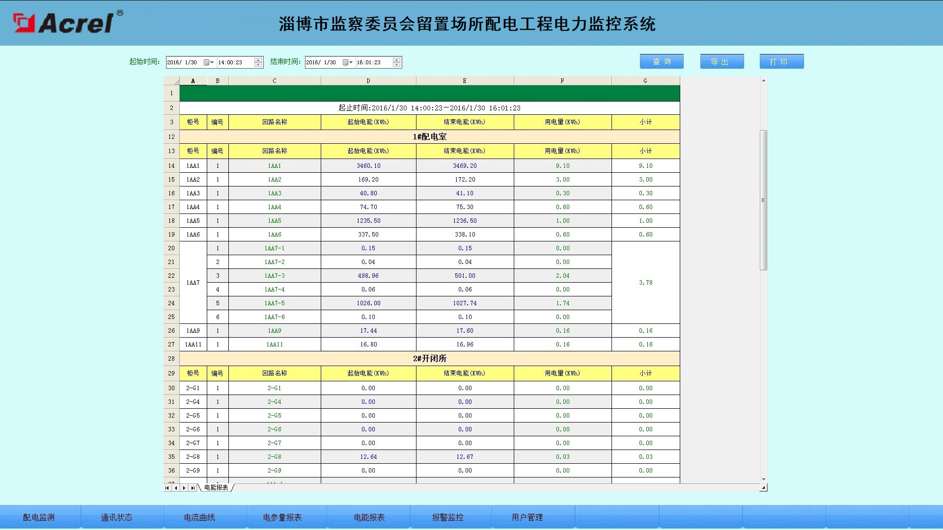 用電量報(bào)表功能,可選擇時(shí)間段進(jìn)行查詢,支持任意時(shí)間段電度累計(jì)查詢,具備數(shù)據(jù)導(dǎo)出和報(bào)表打印等功能。為值班人員提供了可靠的電能報(bào)表。該報(bào)表各回路名稱和數(shù)據(jù)庫關(guān)聯(lián),方便用戶修改回路名稱。如下圖所示,顯示配電室某段時(shí)間內(nèi)的各配電回路的用電量,用戶可以直接打印報(bào)表,可以以EXCEL格式另存到其他位置。 見圖(3)。 圖(3) 電能報(bào)表