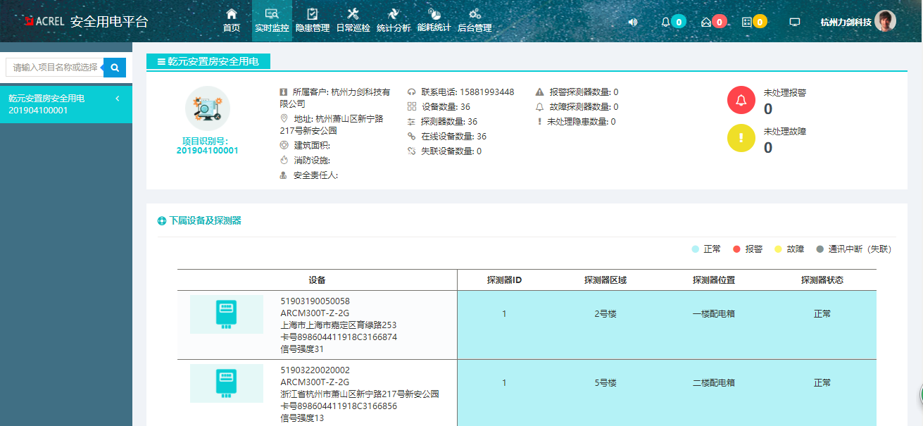 通過實時監(jiān)控界面,除了可以實時顯示項目所屬客戶、地址、建筑面積、消防設施、安全責任人、聯(lián)系電話、設備數(shù)量、探測器數(shù)量等信息,還以更醒目的方式顯示了未處理報警和未處理故障信息,下屬設備和探測器,并可以查看各設備以及探測器基本信息、開關(guān)操作、數(shù)據(jù)監(jiān)控、實時數(shù)據(jù)、參數(shù)設置、歷史信息和報警信息等。