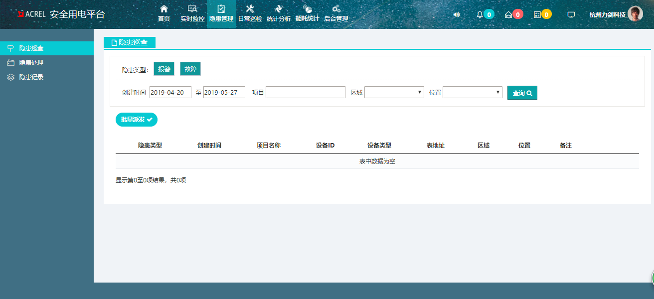 隱患管理包括隱患巡查、隱患處理、和隱患記錄,隱患巡查的目的是為了隱患產(chǎn)生之后下發(fā)工單,所以頁面中只顯示未下發(fā)工單的隱患記錄,包括隱患類型、創(chuàng)建時間、項目名稱、設備ID、位置、故障原因等記錄,并且可以通過“派發(fā)”按鈕,派發(fā)工作任務;隱患處理即工單處理,表示工單需要當前登錄用戶確認,形成隱患處理的閉環(huán),頁面中只顯示發(fā)給當前登錄用戶且未處理的工單記錄;隱患記錄顯示所有的隱患記錄,可以按照隱患類型(報警、故障)、狀態(tài)(未派發(fā)、已派發(fā)未處理、已派發(fā)已處理)分類顯示,支持按照創(chuàng)建時間、項目名稱、所在區(qū)域等條件來對隱患記錄信息進行針對性的查詢操作。