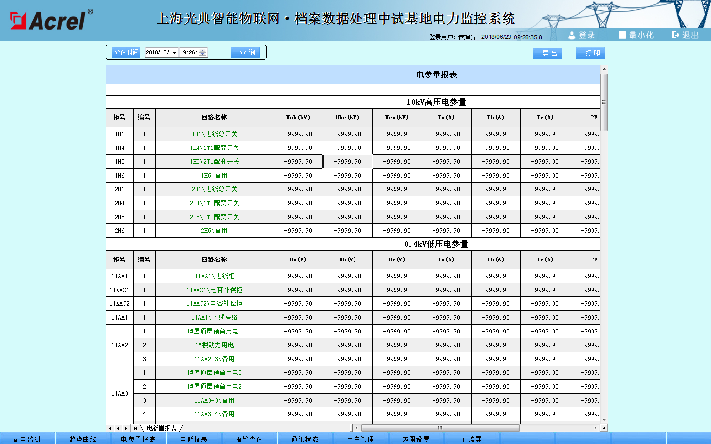 主要功能:查詢各回路或者設(shè)備指定時(shí)間的運(yùn)行參數(shù),報(bào)表中顯示電參量信息應(yīng)包括:各相電流、三相電壓、總功率因數(shù)、總有功功率、總無功功率、正向有功電能等。電參量報(bào)表也支持導(dǎo)出Excel格式文件,還可以根據(jù)用戶要求導(dǎo)出PDF格式文件。