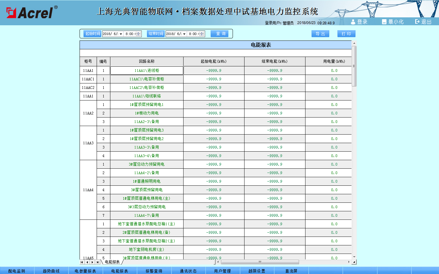 主要功能:具有起始時(shí)間和結(jié)束時(shí)間的時(shí)間選擇框,選定想要查詢的時(shí)間段后,通過點(diǎn)擊查詢按鈕可查詢出系統(tǒng)項(xiàng)目范圍內(nèi)所有配電回路的用電量??赏ㄟ^導(dǎo)出按鈕將報(bào)表以Excel形式導(dǎo)出保存,通過打印按鈕進(jìn)行報(bào)表打印。