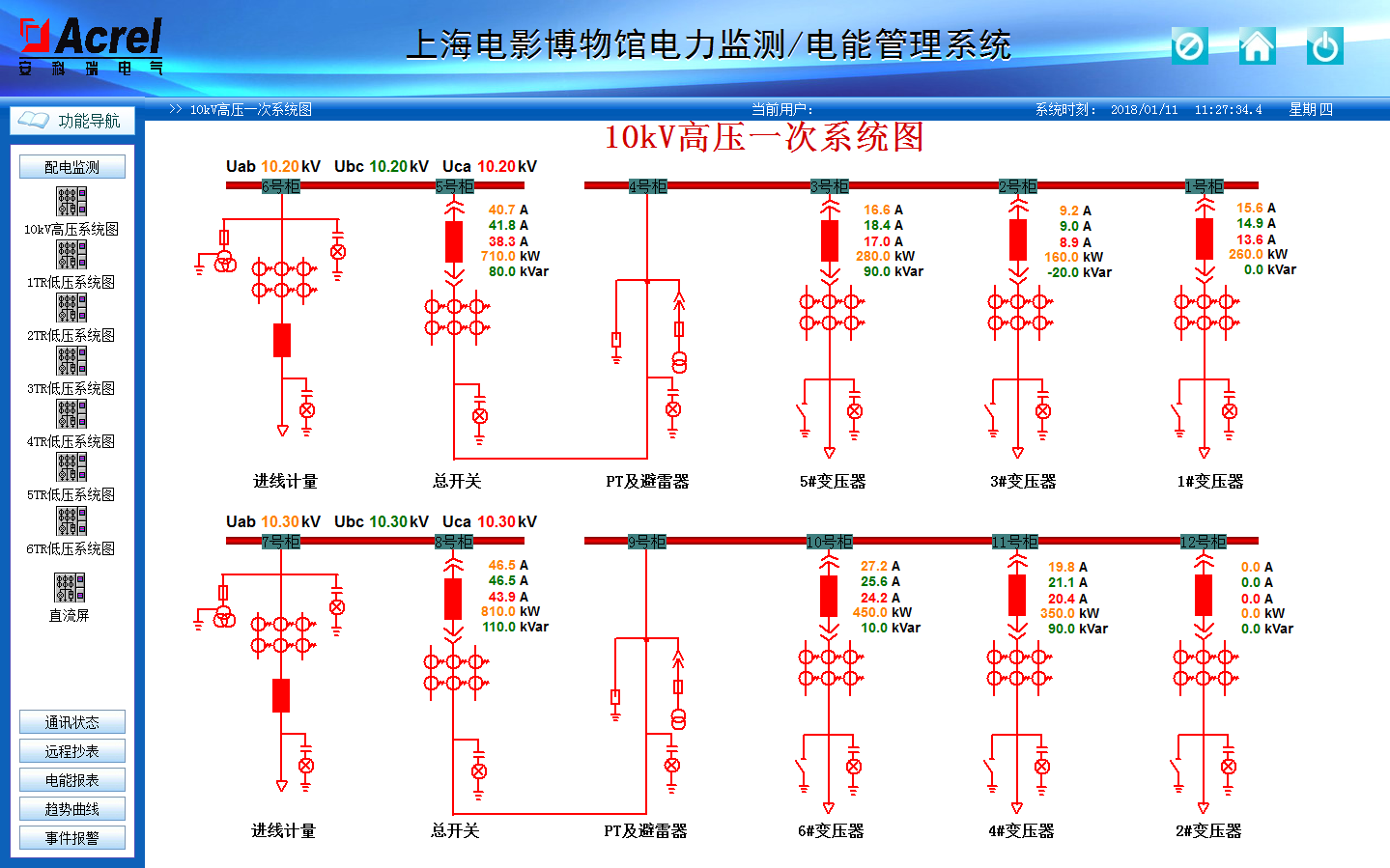 安科瑞Acrel-3000電能管理系統(tǒng)具備友好的人機(jī)界面,能夠以配電一次干線圖的形式直觀顯示配電線路的分布情況,同時(shí)將實(shí)時(shí)采集的各回路的電參量信息,實(shí)時(shí)顯示在系統(tǒng)界面中。