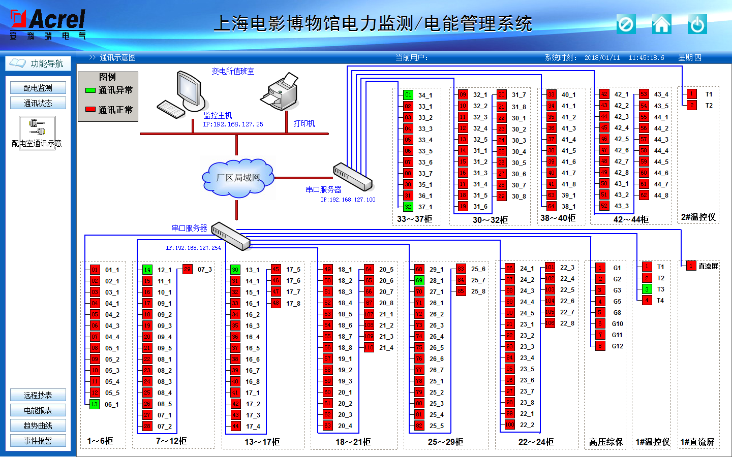 安科瑞Acrel-3000電能管理系統(tǒng)可以實(shí)時(shí)顯示接入系統(tǒng)的各設(shè)備的通訊狀態(tài),能夠完整的顯示整個(gè)系統(tǒng)網(wǎng)絡(luò)結(jié)構(gòu),可在線診斷系統(tǒng)網(wǎng)絡(luò)通訊狀態(tài),發(fā)生網(wǎng)絡(luò)故障時(shí)能自動(dòng)在屏幕上顯示故障單元和故障部位。從而方便系統(tǒng)維護(hù)人員實(shí)時(shí)掌握現(xiàn)場(chǎng)各設(shè)備的通訊狀態(tài),對(duì)出現(xiàn)異常的設(shè)備及時(shí)維護(hù),保證系統(tǒng)的穩(wěn)定運(yùn)行。