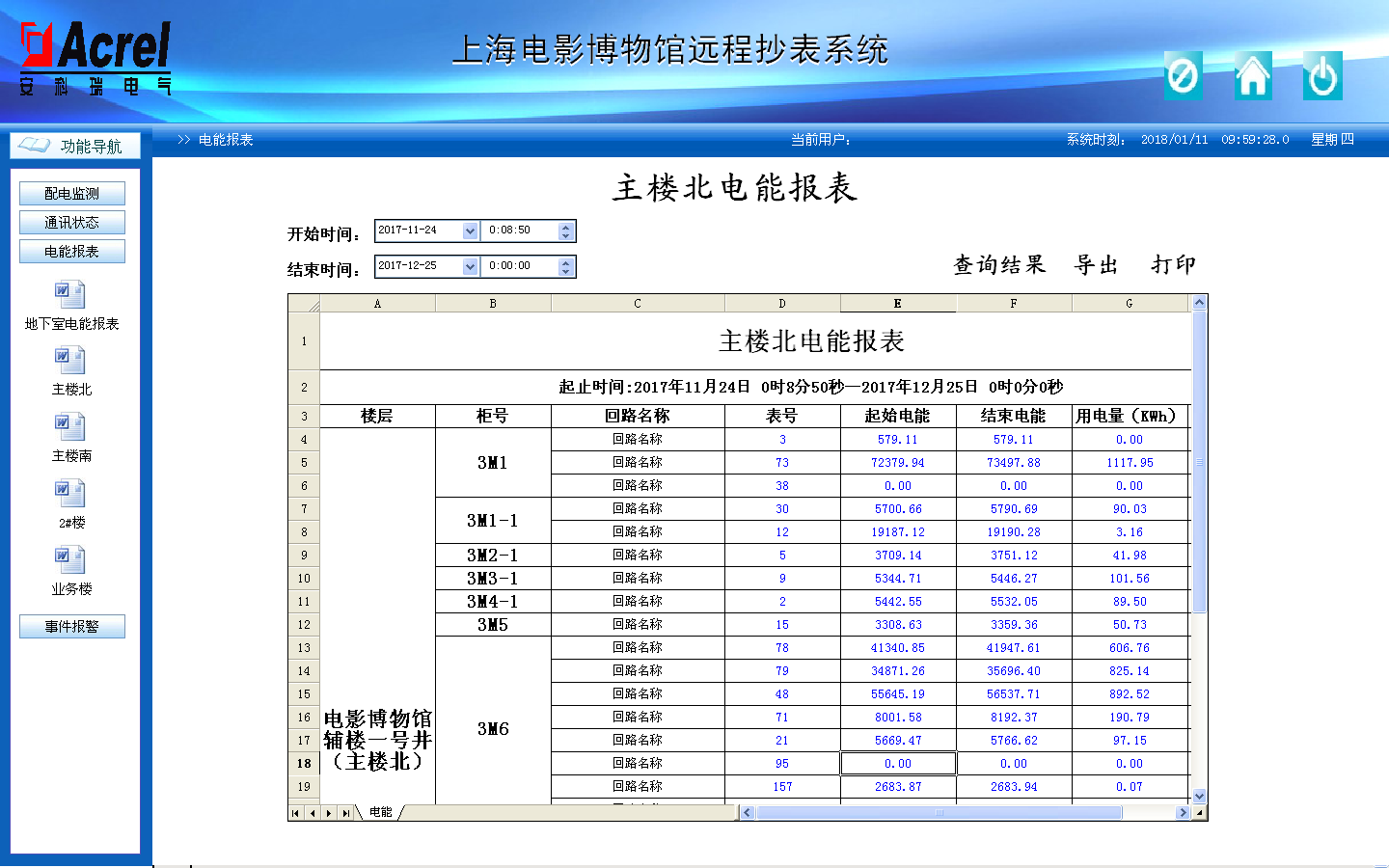具有起始時(shí)間和結(jié)束時(shí)間的時(shí)間選擇框,選定想要查詢的時(shí)間段后,通過點(diǎn)擊查詢按鈕可查詢出系統(tǒng)項(xiàng)目范圍內(nèi)所有配電回路的用電量??赏ㄟ^導(dǎo)出按鈕將報(bào)表以Excel形式導(dǎo)出保存,通過打印按鈕進(jìn)行報(bào)表打印。