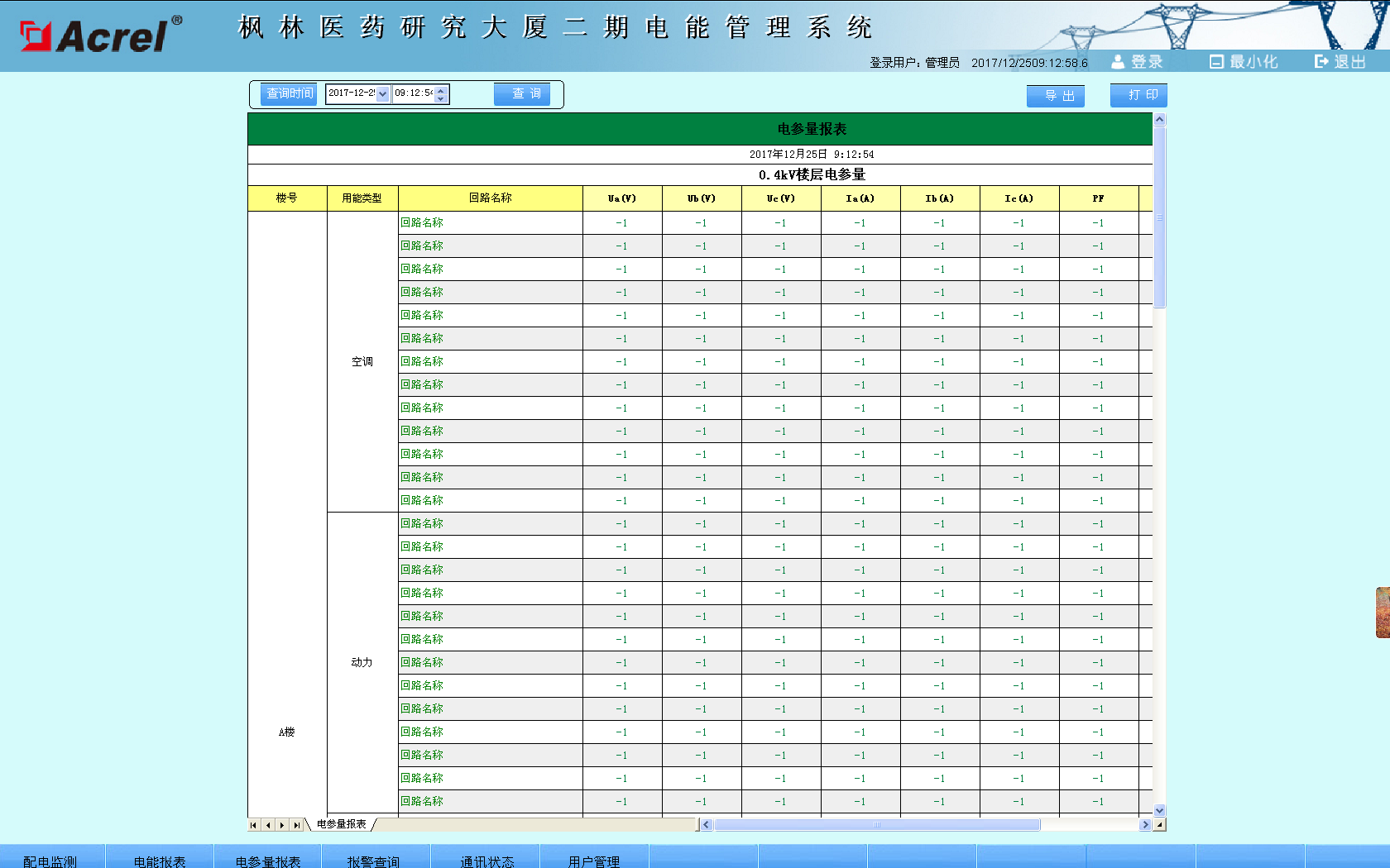 具有起始時間和結束時間的時間選擇框,選定想要查詢的時間段后,通過點擊查詢按鈕可查詢出系統(tǒng)項目范圍內(nèi)所有配電回路的用電量??赏ㄟ^導出按鈕將報表以Excel形式導出保存,通過打印按鈕進行報表打印。