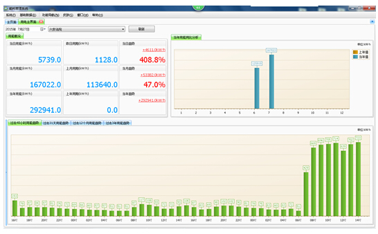 將電耗進行逐時、逐日、逐月、逐年統(tǒng)計。統(tǒng)計數(shù)據(jù)采用餅圖、柱狀圖、線圖、區(qū)域圖等各種圖形展示方式,直觀反映各項統(tǒng)計數(shù)據(jù)的數(shù)值、趨勢和分布情況。